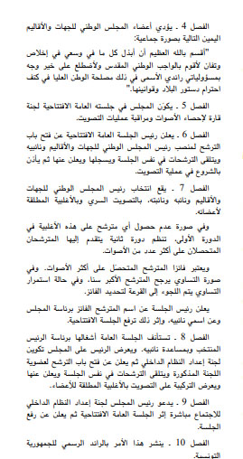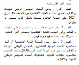 صدر بالعدد الأخير من الرائد الرسمي للجمهورية التونسية اليوم الثلاثاء 16 أفريل 2024، الأمر عدد 196 لسنة 2024 مؤرخ يوم 16 أفريل، والقاضي بدعوة أعضاء المجلس الوطني للجهات والاقاليم إلى حضور الجلسة العامة الافتتاحية وذلك يوم الجمعة 19 أفريل الجاري على الساعة العاشرة صباحا بمقره المخصص بباردو، إلى حين انتخاب رئيس المجلس يرأس مداولات الجلسة العضو الأكبر سنا.