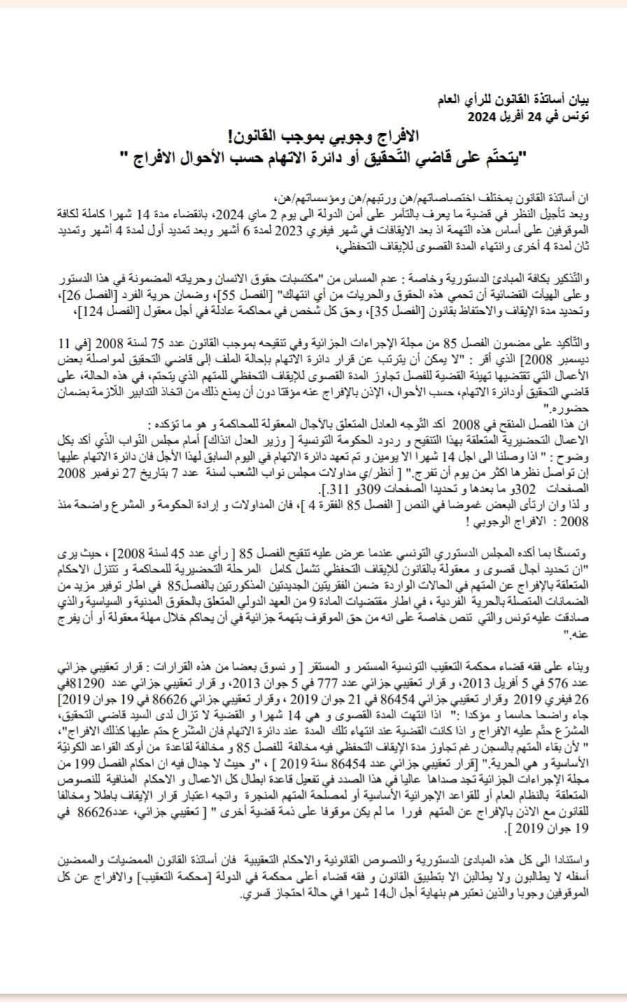 وإعتبر الموقّعون على البيان الصادر اليوم الأربعاء 24 أفريل 2024، والذي تلقّت “الرأي الجديد”، نسخة منه، أنه بعد إنتهاء آجال الإيقاف المحدّدة بـ 14 شهرا، فإن الموقوفين في “حالة إحتجاز قسري”، وذلك بعد تأجيل النظر في قضية “التآمر”، إلى يوم 2 ماي القادم، وفق ما جاء في البيان، الذي تمّ توقيعه من قبل أكثر من 30 شخصا.