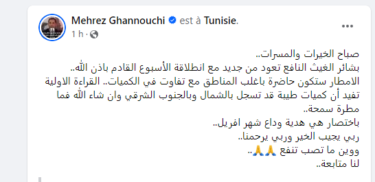 وأضاف محرز الغنوشي، في تدوينة على حسابه بموقع التواصل الإجتماعي “فيسبوك”، أن الأمطار ستكون حاضرة بأغلب المناطق مع تفاوت في الكميات، حسب تعبيره.
