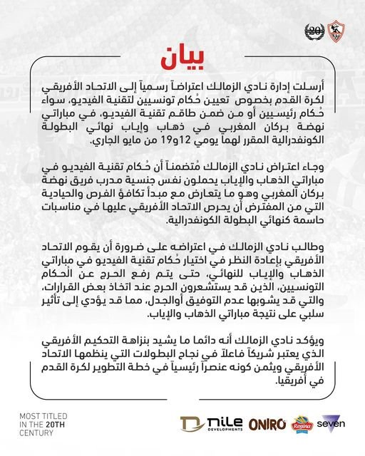 أعلن نادي الزمالك المصري، أنه راسل الإتحاد الإفريقي لكرة القدم للإعتراض على تواجد حكام تونسيين في تقنية الفيديو، (الفار)، خلال مباراتي الذهاب والإياب لنهائي كأس الكنفدرالية الأفريقية، ضدّ نهضة بركان المغربي.