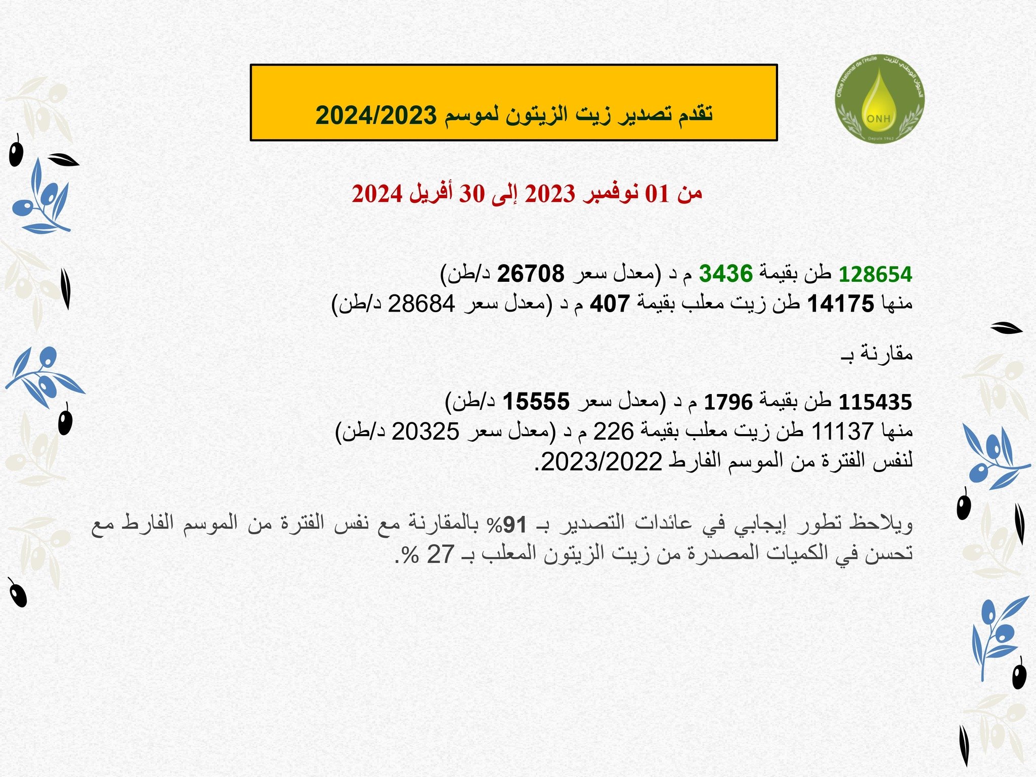 وجاء ذلك في بلاغ نشره الديوان على صفحته الرسمية، حول آخر الإحصائيات، بخصوص تقدّم تصدير زيت الزيتون لموسم 2023/2024 .