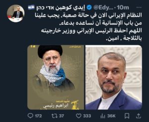 وكان الصحفي الإسرائيلي، إيدي كوهين، غرد على تويتر بطريقة شامتة لحادث المروحية الإيرانية، تنم عن تورط إسرائيلي واضح في العملية، وهو ما عكسته المواقع والصحف الإسرائيلية منذ حصول الحادث..