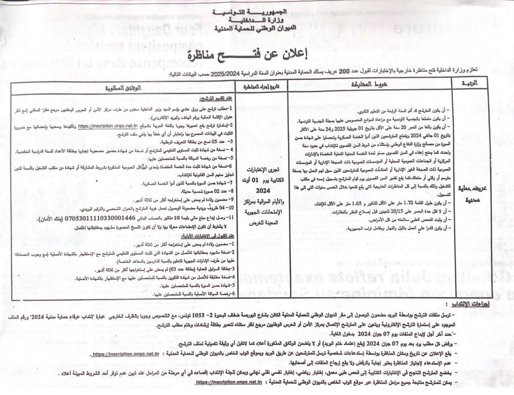 أعلنت وزار ة الداخلية، اليوم الإثنين 20 ماي، عن فتح مناظرة خارجية بالاختبارات لقبول 200 عريف بسلك الحماية المدنية، بعنوان السنة الدراسية 2024-2025 حسب البيانات التالية: