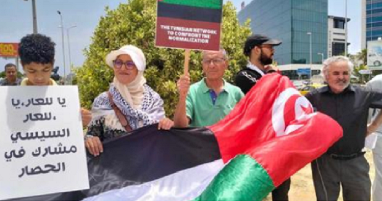 ونظمت “الشبكة التونسية للتصدّي لمنظومة التطبيع”، مسيرة باتجاه محيط السفارة المصرية، للتعبير عن إدانتهم للموقف المصري المخزي من الأحداث الدائرة، خاصة بعد استيلاء الاحتلال على معبر رفح، واستمرار منع دخول المساعدات إلى القطاع إلا بالشيء القليل، الذي لا يغني ولا يسمن من جوع.