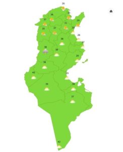 وحسب المرصد الوطني للرصد الجوي، تكون درجات الحرارة موزعة كالتالي على مختلف ولايات الجمهورية: