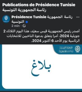“أصدر رئيس الجمهورية قيس سعيّد، هذا اليوم الثلاثاء 2 جويلية 2024، أمرا يتعلق بدعوة الناخبين للانتخابات الرئاسية يوم الأحد 6 أكتوبر 2024”.