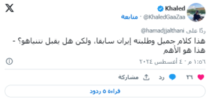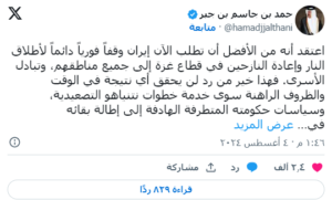 وأضاف حمد بن جاسم في منشور عبر حسابه الرسمي على منصة “إكس”، تويتر سابقا: “أعتقد أنه من الأفضل أن تطلب الآن إيران وقفاً فورياً دائماً لإطلاق النار وإعادة النازحين في قطاع غزة إلى جميع مناطقهم، وتبادل الأسرى”.
