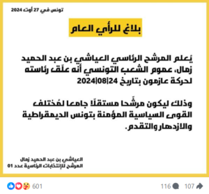 وقال في هذا البيان، أنّ هذا الخيار ينبني على أساس أن “يكون العياشي زمّال مرشّحا مستقلّا للانتخابات الرئاسية 2024،  وجامعا لمُختلف القوى السياسية المؤمنة بتونس الديمقراطية والازدهار والتقدم”، وفق تعبير البيان، الذي جاء مقتضبا..