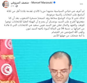 وأضاف المرزوقي اليوم السبت، في تدوينة على صفحته بفيسبوك، أنّه “لا فائدة من إجراء انتخابات يفوز فيها سعيّد بنسبة 94% أسوة بأخيه تبون”، في إشارة إلى نتائج انتخابات الجزائر الرئاسية.