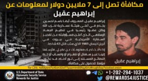 تتهم الولايات المتحدة إبراهيم عقيل بالتورط في تفجير مبنى السفارة الأمريكية في بيروت عام 1983، وقد قدمت مكافآة قدرها 7 ملايين دولار لمن يدلي بعلومات عن عقيل.