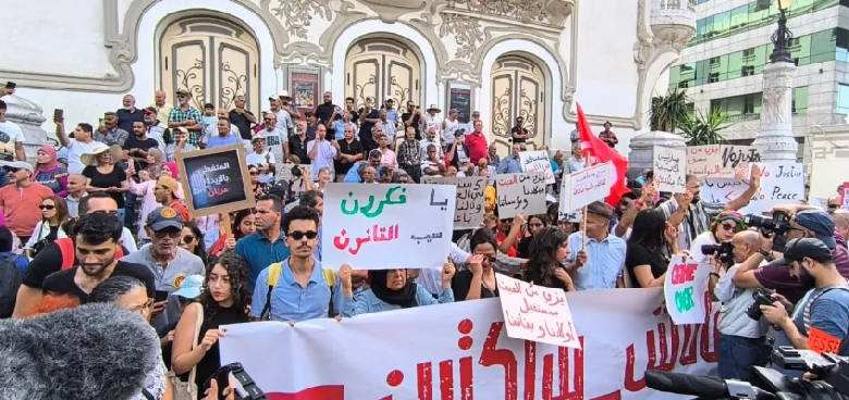 ومن أبرز الشعارات المرفوعة، “حريات حريات لا قضاء التعليمات”، و”لا قضاء لا قانون الشرفاء في السجون”، و”لا خوف لا رعب الشارع ملك الشعب”، و”انتخابات مسرحية والعصابة هي هي”، بالإضافة إلى “يسقط يسقط المرسوم.. باسم الشارع والمظلوم”، و”الشعب يريد إسقاط النظام”، و”هايلة البلاد ظلم واستبداد”، و”جاك الدور جاك الدور. يا قيس يا دكتاتور”..