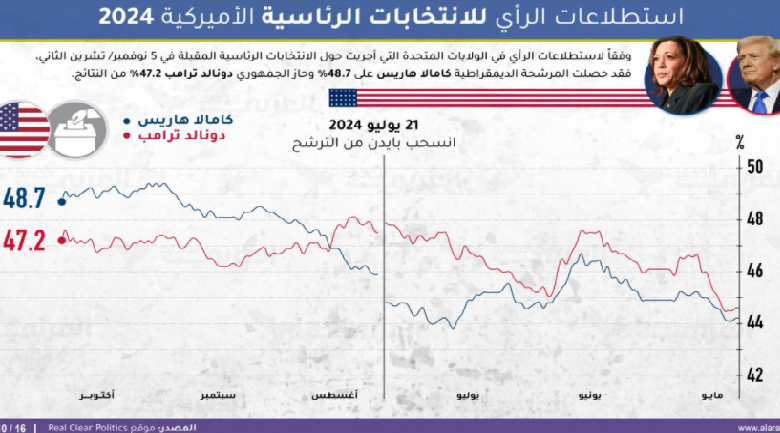 وفقاً لاستطلاعات الرأي في الولايات المتحدة التي أجريت حول الانتخابات الرئاسية المقبلة المرتقبة في الخامس من نوفمبر، حصلت المرشحة الديمقراطية كامالا هاريس على 48.7% وحاز الجمهوري دونالد ترامب 47.2% من الأصوات.