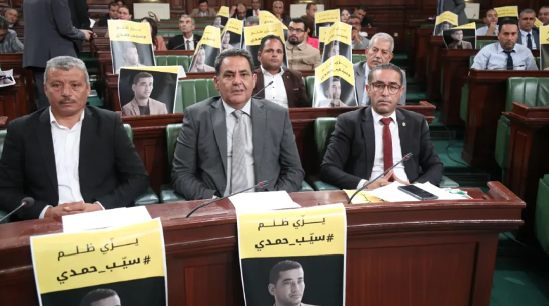 وكان عدد من النواب وضعوا في حركة احتجاجية لافتات صفراء على مكاتبهم بقاعة الجلسة العامة كُتب عليها “يزي ظلم سيب حمدي” إلى جانب صور للنائب الموقوف (منذ الأسبوع الفارط)، وقد تسبّبت هذه الحركة في تأخير انطلاق الجلسة لما يناهز الساعة.