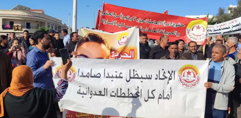 ورفع المشاركون شعارات تنادي بالحرية للموقوفين والموقوفات وبالشغل والحرية والكرامة للعمال، مندّدين بهجمة رأس المال على الحقوق العمالية والنقابية.
