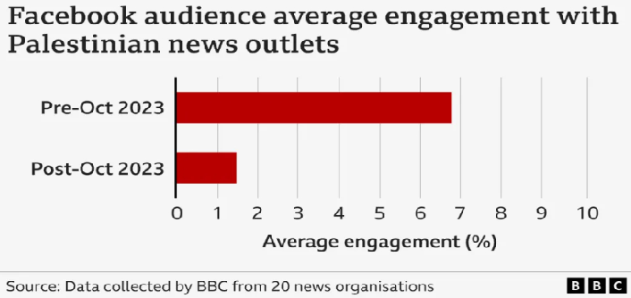 وكشف فحص “بي بي سي”، أن “هناك انخفاضا بنسبة 77% في التفاعل مع حسابات فيسبوك الخاصة بالمؤسسات الإعلامية الفلسطينية بعد السابع من أكتوبر”. وفي المقابل، زاد التفاعل مع صفحات فيسبوك للمؤسسات الإعلامية، التي تتخذ من فلسطين المحتلة مقرا لها.