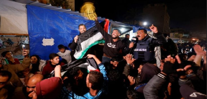 احتفل آلاف الفلسطينيين في قطاع غزة، مساء الأربعاء، مع إعلان التوصل لاتفاق وقف إطلاق النار وتبادل الأسرى بين إسرائيل وحركة حماس..