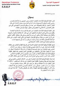 وعبرت النقابة عن انخراط المؤسسات الاعلامية الخاصة بالقيام بدورها في تقديم المعلومة والتعليق الحر في اطار الاستقلالية والحياد والمهنية والدفاع عن مصلحة البلاد مشيرة الى دورها المحوري في ظل مخاطر التأثير السلبي على الرأي العام، من خلال مواقع التواصل الاجتماعي والتي اثبتت التجارب في العالم انها قابلة للتضليل والتلاعب بها من طرف اي قوى ترغب في توجيهها حسب مصالحها خاصة مع انتشار الذكاء الاصطناعي.
