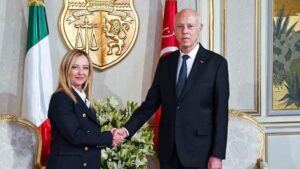 وتأكيدًا لهذا التوجّه، زارت ميلوني تونس في 6 يونيو/ حزيران 2023، وأعلنت تقديم مساعدات بقيمة 700 مليون يورو لدعم قطاعات حيوية، مع مواصلة الضغط من أجل تسهيل الاتفاق مع الصندوق. بيدَ أنّ هذه الوساطة لم تنجح في إقناع الرئيس قيس سعيّد بقبول الإصلاحات المطلوبة، ما أبقى التمويل معلقًا إلى الآن، رغم استمرار الجهود الدبلوماسية الإيطالية لإنقاذ الوضع.