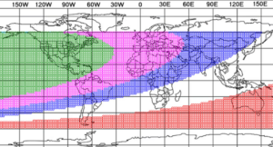 - رؤية الهلال مستحيلة من المناطق الواقعة في اللون الأحمر بسبب غروب القمر قبل غروب الشمس أو/و بسبب حصول الاقتران السطحي بعد غروب الشمس.