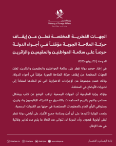أعلنت قطر، اليوم الاثنين، إيقاف حركة الملاحة الجوية مؤقّتا في أجوائها ضمن ما قالت إنها “مجموعة من الإجراءات الاحترازية التي تقرر اتخاذها من قبل الدولة..