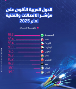 وفيما يلي إنفوغرافيك بتصنيف الدول العربية على مؤشر الاتصالات والتقنية لعام 2025.