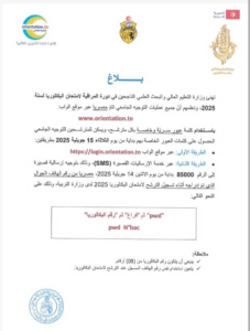 أعلمت وزارة التعليم العالي والبحث العلمي الناجحين في دورة المراقبة لامتحان البكالوريا، أن عمليات التوجيه الجامعي تتم حصريا عبر موقع الواب www.orientation.tn..