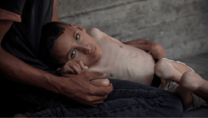 كما عرضت الشبكة صورة أخرى لطفل يحمل كيساً من الطحين، بينما تبدو على وجهه ملامح العوز والانكسار.