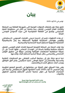 واعتبرت الحركة في بيان اليوم الأربعاء، أنّ التطورات “تخل بالديناميكية التشاركية الضرورية لاستقرار البنية الاجتماعية والسياسية”.
