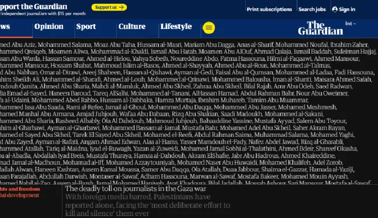 وبينت الصحيفة أن هذه الحرب أضحت الأكثر فتكا للإعلام في التاريخ الحديث، في حين نشرت أسماء جميع الذين أدرجتهم لجنة حماية الصحفيين (سي بي جيه) في قائمة الشهداء، للتذكير بتضحياتهم، بعد أن تعرضوا للتهديد والاستهداف، وعملوا في ظروف لا تطاق، من الجوع والإرهاق، من أجل إيصال الحقائق إلى العالم.