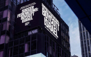 “إسرائيل ترتكب إبادة جماعية — اتحادات كرة القدم: قاطعوا إسرائيل”.