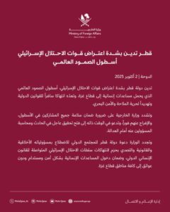 أدانت الخارجية القطرية بشدة، اعتراض قوات الجيش الإسرائيلي أسطول الصمود العالمي المتجه إلى قطاع غزة، مؤكدة “ضرورة ضمان سلامة جميع المشاركين والإفراج عنهم فورا”.