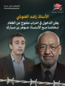 وأوضح بقوله: “راشد الغنوشي (٨٤ عاما) المفكر والمجدد الأهم في الفكر السياسي الإسلامي بالعالم العربي، يقرر من محبسه التعسفي بتونس التضامن بالإضراب عن الطعام مع السجين الليبرالي العلماني مبارك بن جوهر المضرب عن الطعام حتى الموت”.