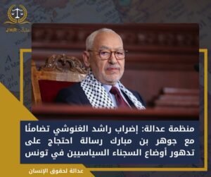 وعبرت منظمة عدالة لحقوق الإنسان عن قلقها البالغ لإعلان الغنوشي، دخوله في إضراب مفتوح عن الطعام داخل سجنه، معتبرة أن هذه الخطوة تمثل “صرخة احتجاج سياسي وإنساني ضد ما آلت إليه أوضاع حقوق الإنسان في تونس، في ظل تزايد حالات الإضرابات الفردية عن الطعام بوصفها وسيلة أخيرة للتعبير عن اليأس من منظومة العدالة وغياب قنوات الإنصاف”.