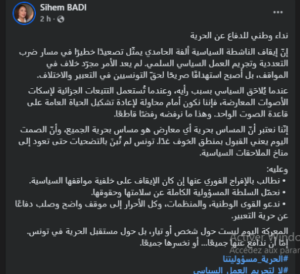واعتبرت القيادية السابقة في حزب المؤتمر من أجل الجمهورية، أنّ “المساس بحرية أي معارض هو مساس بحرية الجميع، وأنّ الصمت اليوم يعني القبول بمنطق الخوف غدا”، مشددة على أنّ “المعركة اليوم ليست حول شخص أو تيار، بل حول مستقبل الحرية في تونس.. إمّا أن ندافع عنها جميعا… أو نخسرها جميعا”.