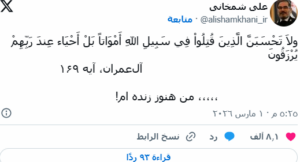 لم يأت النعي أو النفي بطريقة تقليدية، بل اختار القائمون على حساب شمخاني مزيجا من القدسية الدينية والرمزية السينمائية العالمية. فقد استهل الحساب تغريدته بالآية الكريمة من سورة آل عمران: “ولا تحسبن الذين قتلوا في سبيل الله أمواتا بل أحياء عند ربهم يرزقون”، وهي الآية التي تتلى عادة لتأكيد نيل رتبة الشهادة.