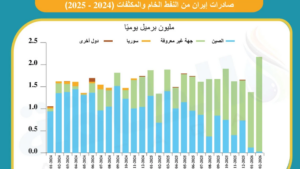 ويوضح الرسم الآتي -من إعداد منصة الطاقة المتخصصة- حجم صادرات النفط الإيراني خلال العامين الماضيين، ووجهاتها: