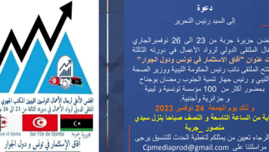 جربة ــ الرأي الجديد ينظم المجلس الأعلى لرجال الأعمال التونسيين الليبيين، من 23 إلى 26 نوفمبر بجزيرة جربة، أشغال الملتقى…