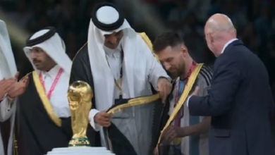 أمير قطر يلبس ميسي “البشت العربي” أثناء تسلم كأس العالم (شاهد)